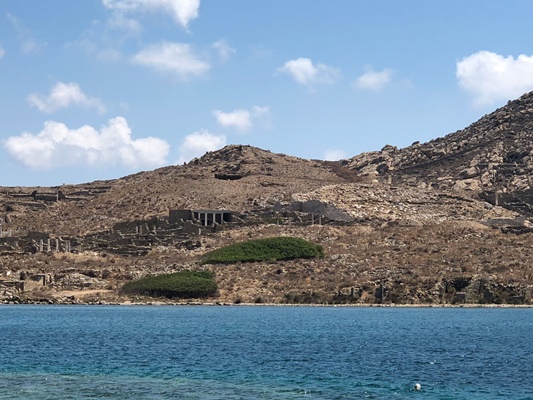 Na ongeveer twee heerlijk rustige uren op het eiland Rhenia varen we omstreeks 15.00 uur terug naar Mykonos waarbij we langs Delos eiland zeilen en uitzicht hebben op de bekende archeologische gebouwen.