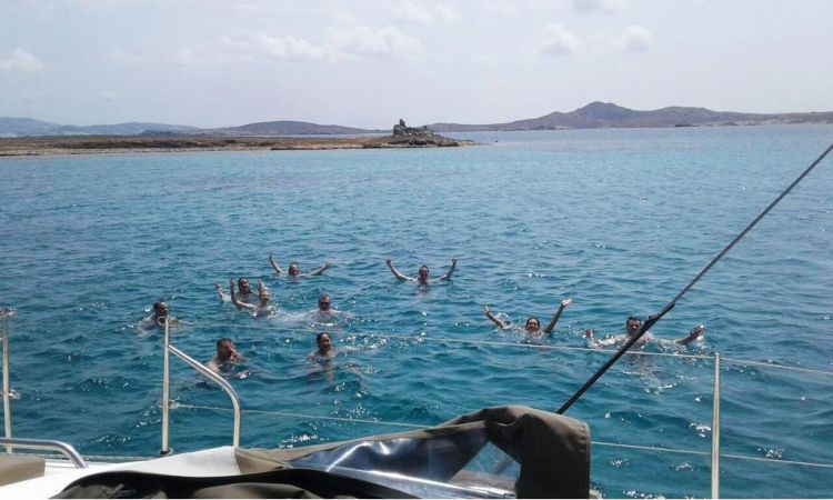 Na ongeveer een uur varen, arriveer je op het ongerepte eiland Rhenia, gescheiden van het heilige eiland Delos door slechts een kleine zeestraat. Hier kun je genieten van het zwemmen en snorkelen. De lichte lunch wordt ondertussen aan boord klaargemaakt. Het is speciaal gemaakte Italiaanse pasta met een dressing met Griekse smaak die direct aan boord wordt bereid, Griekse salade en sappig seizoensfruit. Er wordt ook een selectie gratis huiswijn en frisdranken aangeboden.