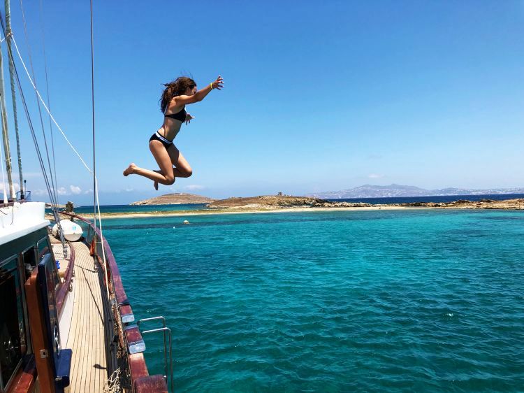 Na ongeveer een uur varen, zullen we aankomen op het ongerepte eiland Rhenia, gescheiden van het heilige eiland Delos door slechts een kleine zeestraat. We gaan voor anker in de idyllische baai omgeven door kristalhelder turquoise water, genieten van een verfrissende duik. Snorkeluitrusting is beschikbaar aan boord voor gratis gebruik. Een heerlijk ruime buitenomgeving aan boord van het zeiljacht maakt het voor al onze gasten mogelijk om zich nooit opgesloten te voelen en te genieten van zonnebaden op comfortabele dekkussens. Het is ook mogelijk om de schaduw op te zoeken. De lunch wordt klaargezet en is een feest van traditionele Griekse smaken geserveerd met een buffet in mediterrane stijl en een selectie van gratis wijn, bier van de tap en frisdranken.